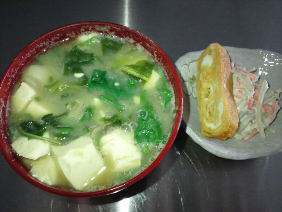 小松菜と三つ葉と豆腐のおみおつけ 玉子焼き 牛蒡のサラダ
