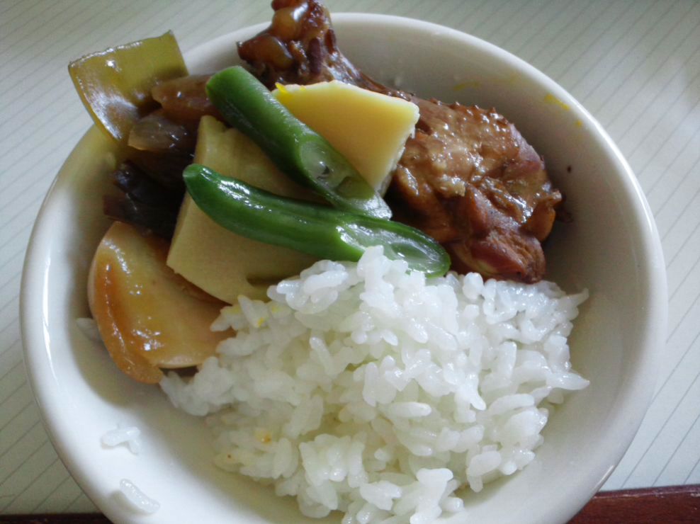 御飯 筍 玉子 手羽元 インゲンの煮物