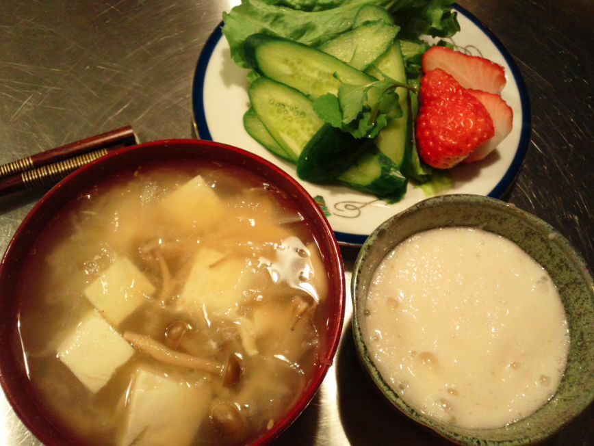 シメジと豆腐のおみおつけ サラダ 苺 自然薯とろろ