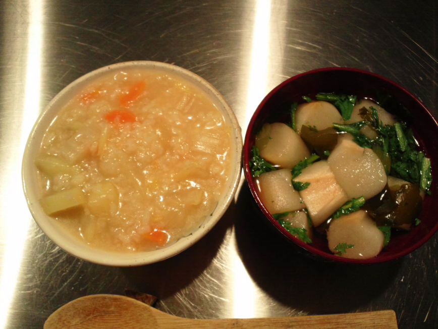 洋風野菜雑炊 お麩と春菊の吸い物 ・・・・・::::::::,’’’’’’’’’