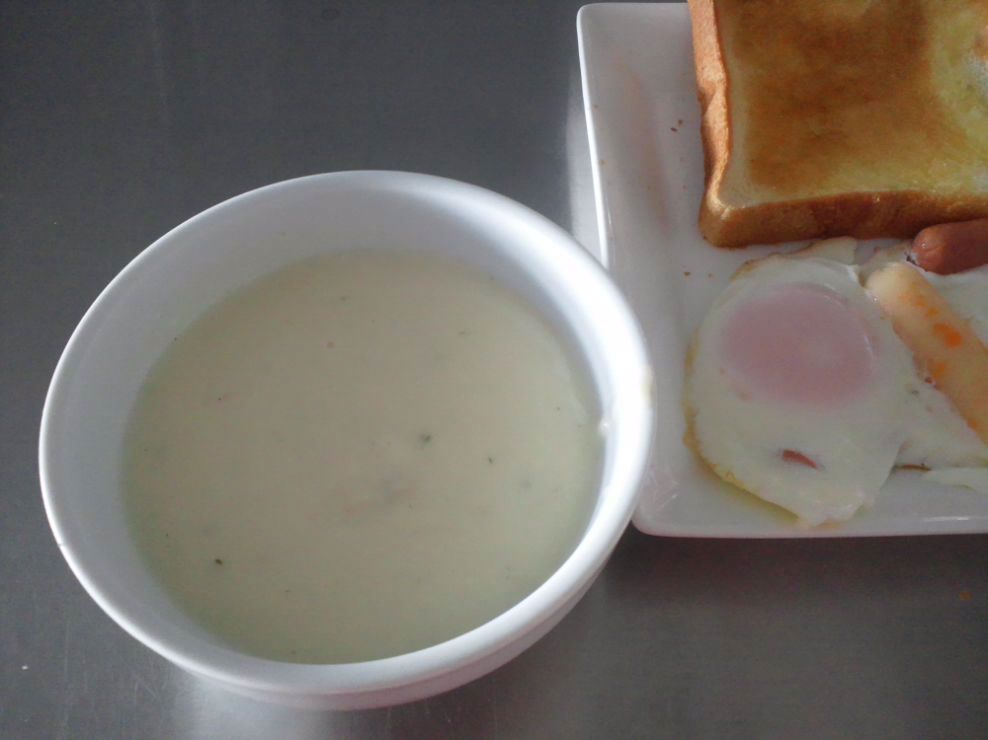 ポタージュスープ、パン、目玉焼き ・・・・・::::::::,’